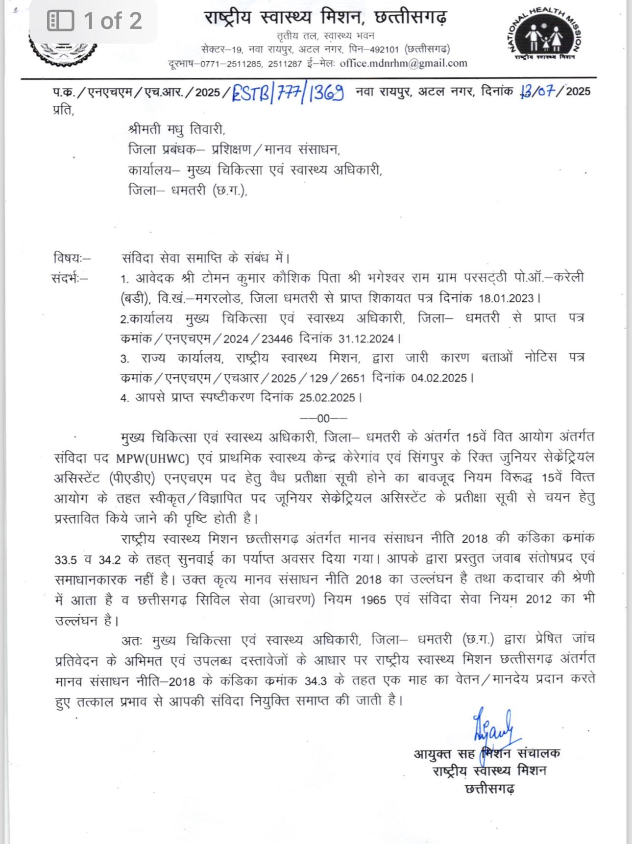 राष्ट्रीय स्वास्थ्य मिशन का राज्य कार्यालय सामान्यत: अवकाश के दिन बंद रहता है, लेकिन मधु तिवारी की सेवा समाप्ति का आदेश रविवार को जारी किया गया — स्पष्ट संकेत कि आदेश बैकडेट में तैयार किया गया।