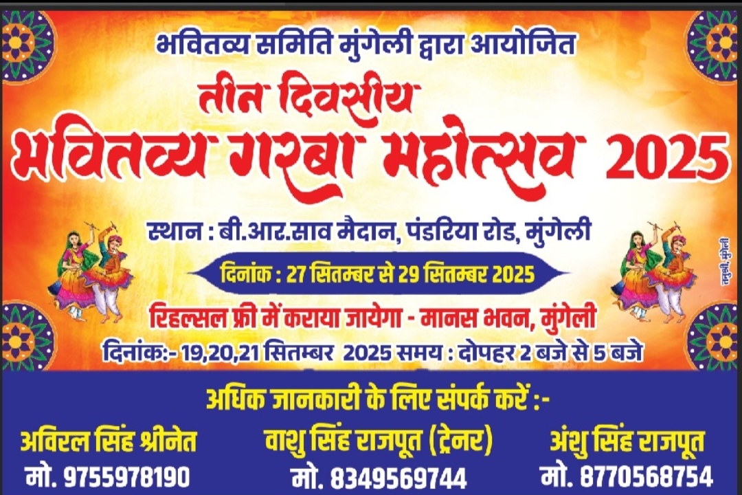 मुंगेली शहर के सांस्कृतिक आयोजनों की कड़ी में इस वर्ष भी गरबा की धूम मचने वाली है। भवितव्य समिति मुंगेली द्वारा आगामी 27 से 29 सितम्बर 2025 तक तीन दिवसीय भवितव्य गरबा महोत्सव का भव्य आयोजन किया जा रहा है। इस आयोजन का स्थल बी.आर.साव मैदान, पंडरिया रोड, मुंगेली तय किया गया है।आयोजन समिति के पदाधिकारियों ने जानकारी देते हुए बताया कि गरबा महोत्सव का उद्देश्य समाज में धार्मिक और सांस्कृतिक परंपराओं को संजोते हुए युवाओं और परिवारों को एक मंच पर लाना है। इस दौरान प्रतिदिन सायंकाल आकर्षक झांकी, देवी की आराधना और गरबा नृत्य की प्रस्तुति होगी। महोत्सव में न केवल शहर बल्कि आसपास के गांव और कस्बों से भी बड़ी संख्या में लोग शामिल होंगे।महोत्सव से पूर्व प्रतिभागियों को गरबा की विशेष प्रशिक्षण सुविधा भी उपलब्ध कराई गई । इसके लिए 19, 20 और 21 सितम्बर 2025 को मानस भवन, मुंगेली में दोपहर 2 बजे से शाम 5 बजे तक रिहर्सल सेशन का आयोजन रखा गया था इस प्रशिक्षण सत्र में सभी इच्छुक प्रतिभागी निःशुल्क हिस्सा लिए। आयोजन समिति का कहना है कि बेहतर प्रस्तुति और गरबा की पारंपरिक शैली से प्रतिभागियों को अवगत कराना इस रिहर्सल का प्रमुख उद्देश्य है।महोत्सव में रंग-बिरंगे परिधानों में सजे युवक-युवतियां डांडिया और गरबा नृत्य की प्रस्तुति देकर पूरे वातावरण को भक्ति और उल्लास से सराबोर कर देंगे। आयोजन स्थल पर सजावट,l प्रकाश व्यवस्था और सुरक्षा के विशेष इंतजाम भी किए जा रहे हैं, ताकि हर वर्ग के लोग गरबा महोत्सव का आनंद ले सकें।आयोजन समिति से जुड़े अविरल सिंह श्रीनेत वाशु सिंह राजपूतl (ट्रेनर) और अंशु सिंह राजपूत ने शहरवासियों से अधिक से अधिक संख्या में शामिल होकर गरबा महोत्सव को सफल बनाने की अपील की है।शहर में पहली बार इस तरह का गरबा महोत्सव तीन दिनों तक लगातार आयोजित किया जा रहा है, जिससे स्थानीय लोगों में खासा उत्साह देखा जा रहा है। आयोजन की तैयारियां जोरों पर हैं और समिति का कहना है कि यह गरबा महोत्सव आने वाले वर्षों के लिए भी एक नई परंपरा स्थापित करेगा।