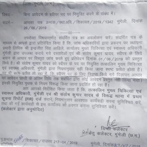 मुंगेली जिले के पूर्व कलेक्टर के निर्देश पर पूर्व CMHO पर एफ आई आर दर्ज करने का आदेश होने के बाद भी अब तक FIR दर्ज नहीं हो सका उधर 3 रिक्त पदों पर 5 की भर्ती की जॉच अटकी,,, पढ़े पूरी खबर।