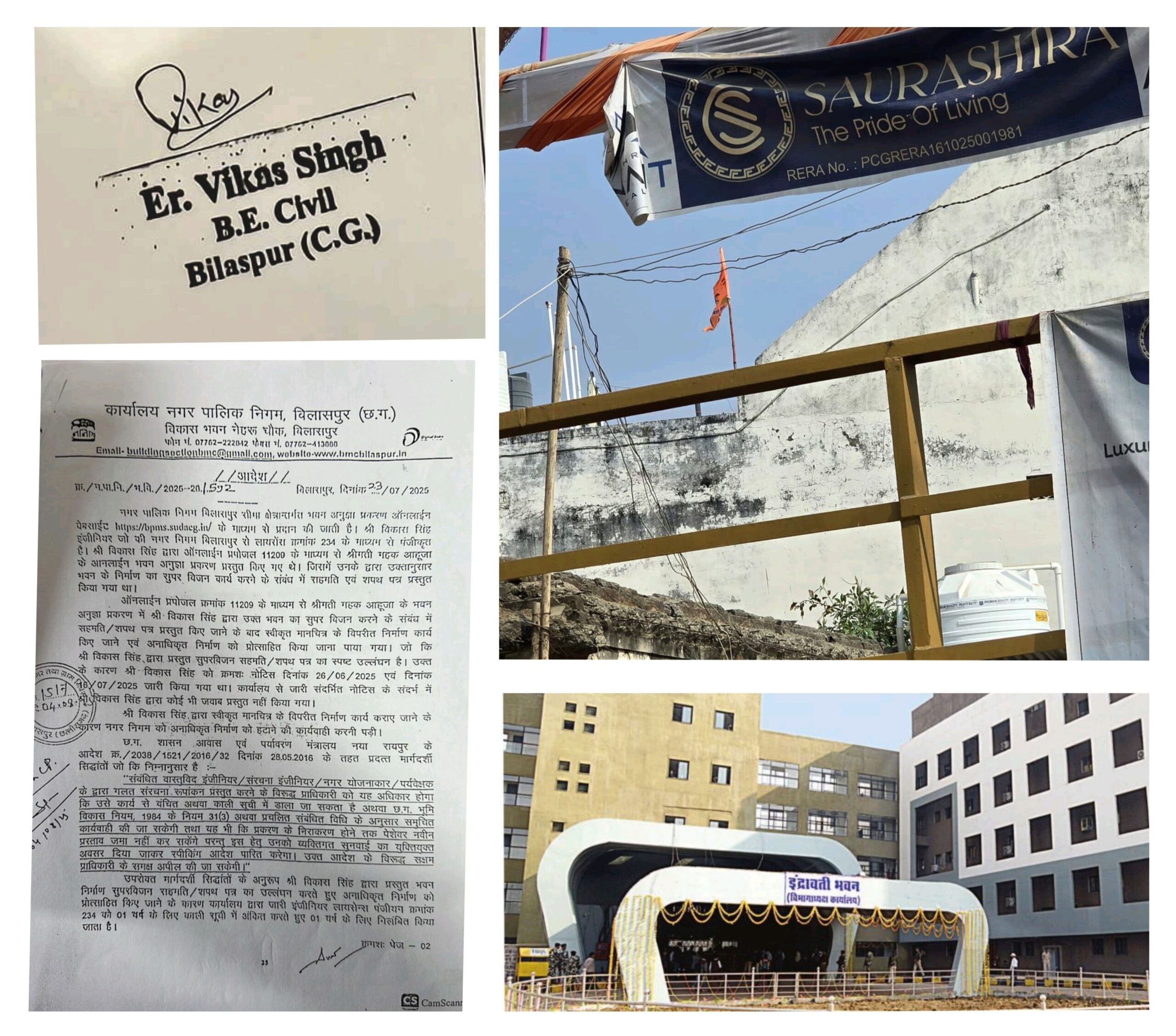 मामले की परतें यहीं समाप्त नहीं होतीं। शहर में हाल ही में अवैध निर्माण के खिलाफ हुई एक कार्रवाई ने इस कथित नेटवर्क की झलक और स्पष्ट कर दी। 13 मई को नगर निगम ने पुराने बस स्टैंड के पास स्थित महुआ होटल पर अवैध निर्माण को लेकर बुलडोजर चलाया था। जब इस होटल के निर्माण से संबंधित दस्तावेजों की जांच की गई तो पाया गया कि इसका नक्शा भी ‘विकास सिंह’ के नाम से स्वीकृत किया गया था।